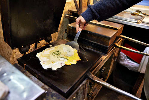 昭和33年創業の老舗店。創業当時から使っているいか焼き器はかなりの年代物。現在ではガスの熱源が主流だが、こちらは電気なので、生地が均一に焼けるのだとか。かすかに塩味がきいた生地は、独自の配合で作る秘伝のもの。そこにスルメイカの胴部分が入っている。焼き立ては格別で、ふっくらもっちりとした食感。噛みしめる度に旨みが広がる。オリジナルのソースは濃すぎず、イカと生地の風味を際立たせている。玉子入りのいか焼きは、玉子の風味がプラスされ、食べ応え充分。10枚単位で購入する人も多く、殺菌と保湿効果のある経木薄板に包んでくれるので、持ち帰っても美味しく食べることができる。10枚以上の場合は、あらかじめ電話で予約しておくとスムーズ。