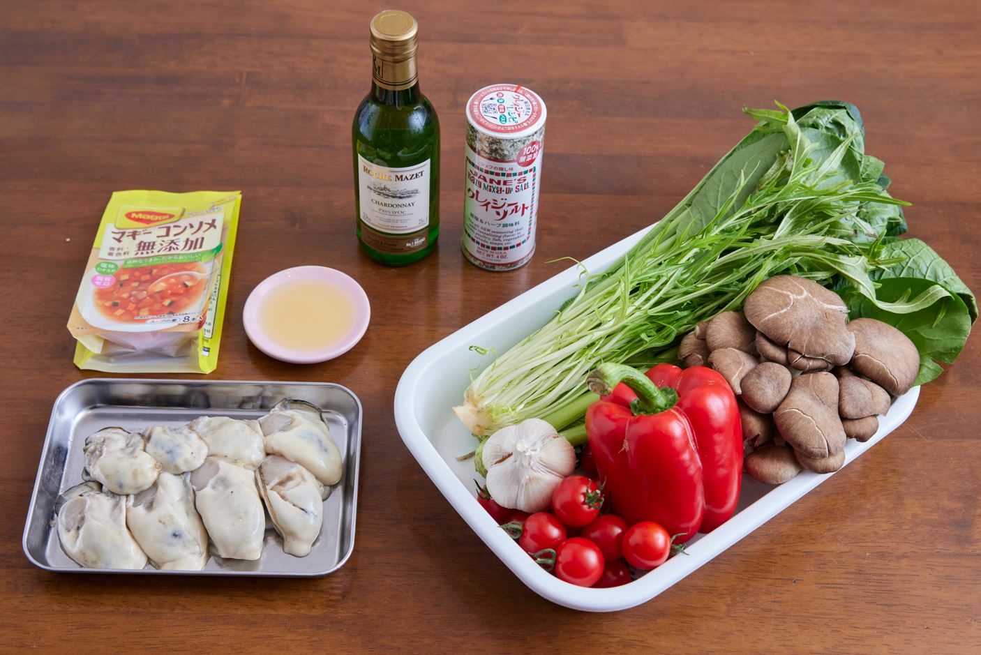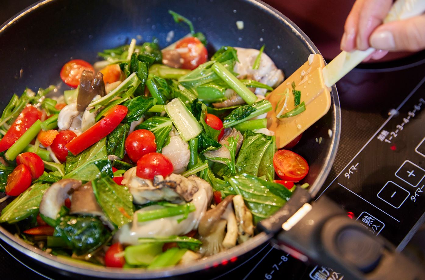 旬を迎える、旨みたっぷりの牡蠣をアクアパッツァに。さらに、小松菜や水菜の葉野菜に、ヒラタケやミニトマトといった野菜をたっぷりと入れることでバランスのとれた一品に仕上がります。シンプルかつ、簡単な調理方法なので「あと一品ほしいな」というときにオススメのレシピです。