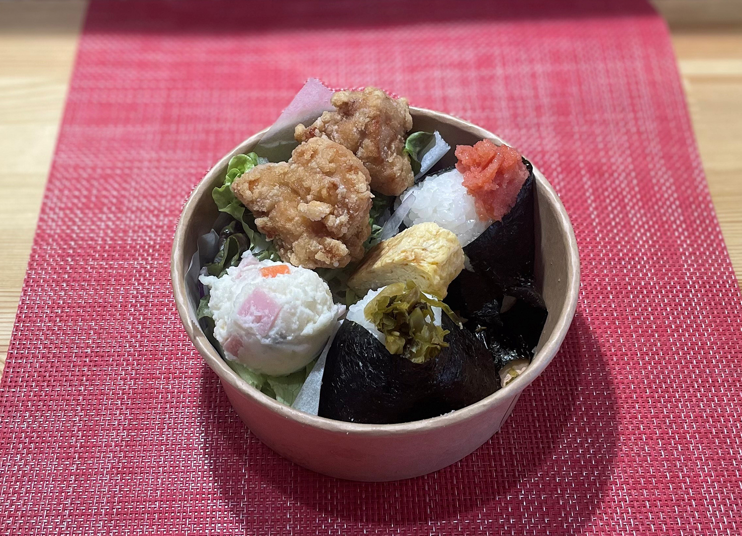 注文を受けてからにぎってくれるので、いつでも作りたてのおいしさ。テイクアウトはもちろん、店内のイートインスペースでできたて・ほかほかを味わうこともでき、そのおいしさを求めて足を運ぶリピーターも多い。お米は兵庫県・丹波篠山の契約農家から仕入れたコシヒカリをガス釜でふっくら炊き上げており、歯切れの良さにこだわった焼き海苔はその香りに感動するおいしさ。おむすびは180円からあり、人気の「高菜(180円)」「しゃけ(200円)」「明太子(200円)」など16種類のおいしさが揃う。また、「唐揚げ(300円)」や「玉子焼(300円)」などの手作りのお惣菜も販売しており、お好きなおむすび2つとお好きなおかずをセットにした「おむすび弁当」(700円)も人気がある。