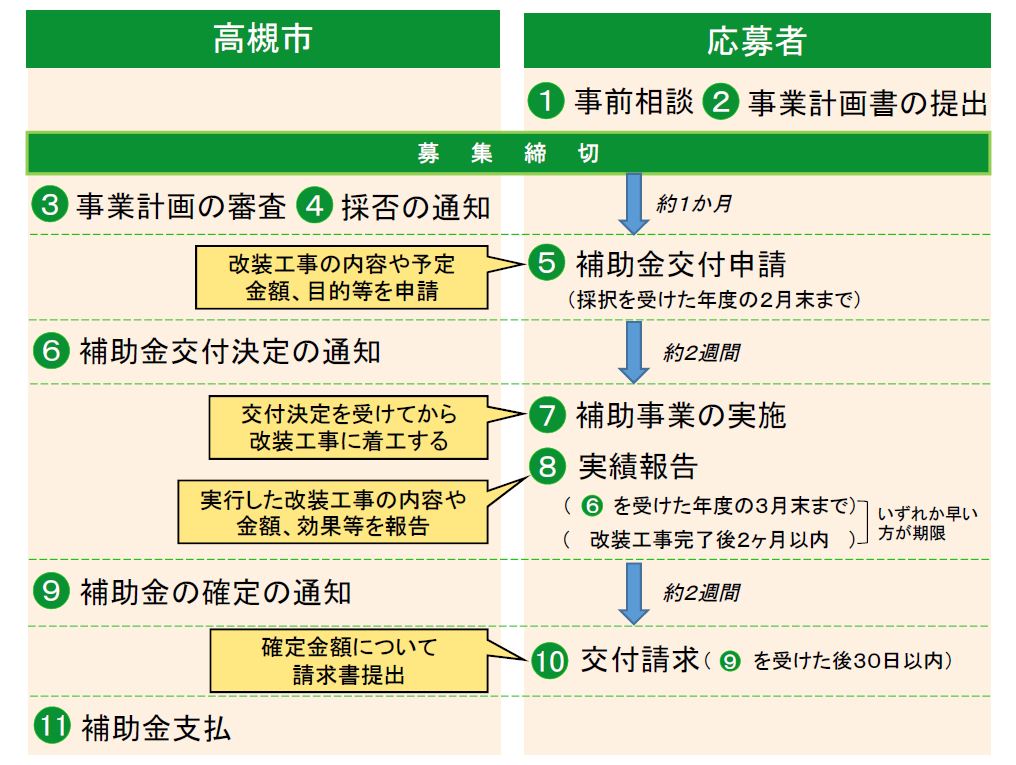 高槻市では飲食店・小売店の新規出店者に対し、最大50万円(店舗改装費用の1/2以内)を補助するプロジェクトを行っている。