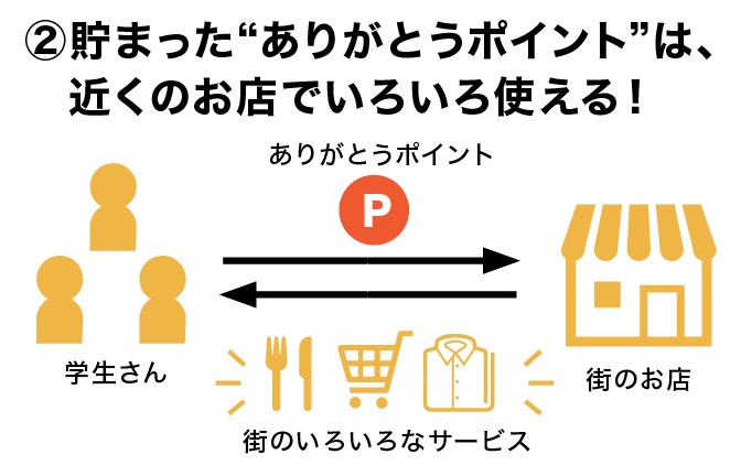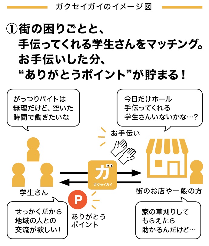 街の困りごとと、手伝ってくれる学生を『ガクセイガイ』のwebアプリを通してマッチングをして、手伝った分が“ありがとうポイント”として貯まる。貯まったポイントは近くの店舗で使用できるという仕組みだ。