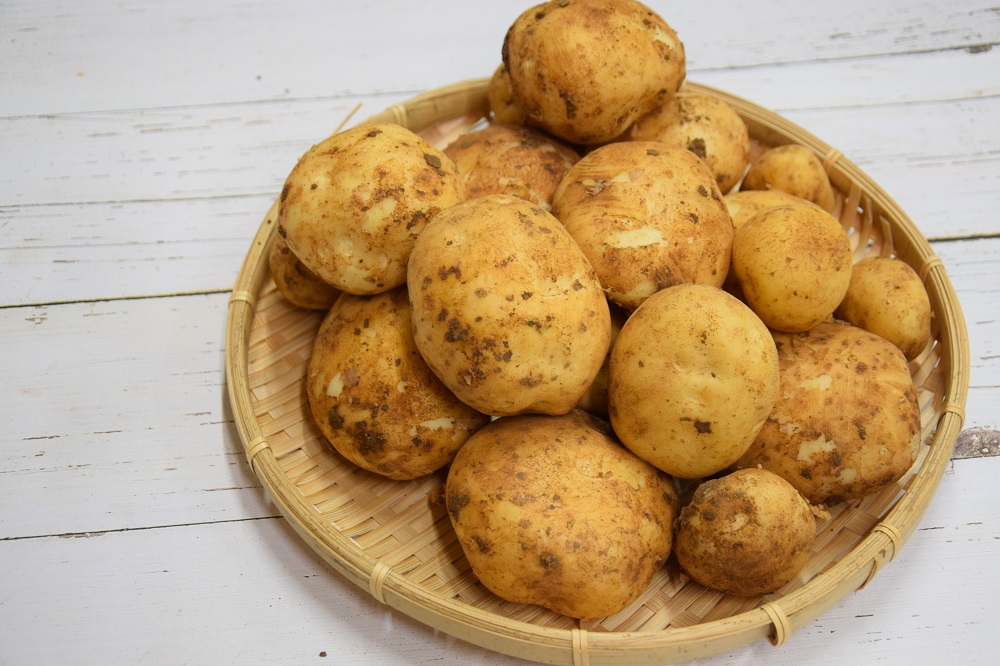 春一番はミネラル分を豊富に含む「赤土」で育ち、美しい肌色が特徴。新じゃがのため水分が多くねっとりした味わいで、皮が薄いためそのまま食べると春の味を感じることができる。芋をふかしてポテサラ、櫛切りにしてフライ、洗った芋の皮に切り目を入れてラップで包みレンチンしバターや辛子明太子などを上において食べるのもおすすめだ。