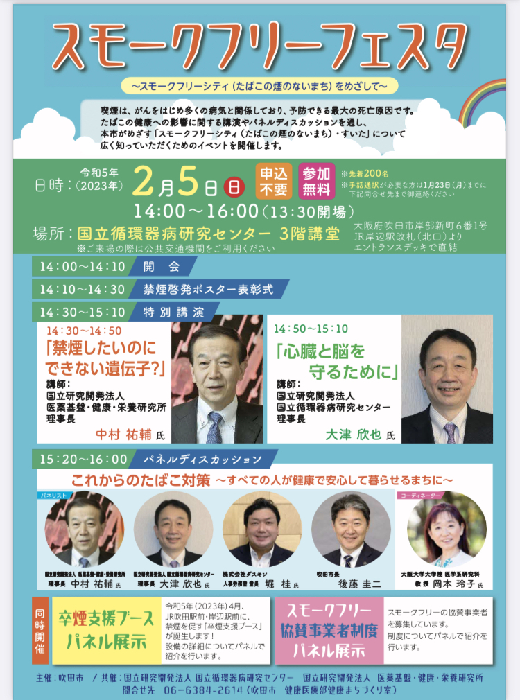 ヒトゲノム解析の第一人者である、医薬基盤・健康・栄養研究所理事長の中村祐輔(なかむら ゆうすけ)氏、「循環器病の予防と制圧」の拠点を目指す国立循環器病研究センター理事長の大津欣也(おおつ きんや)氏より、たばこの健康への影響に関する講演を行う。