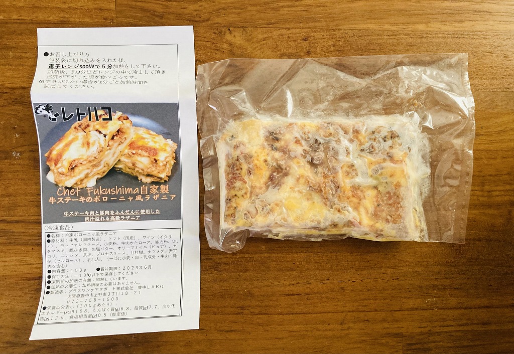 今回は「手作り牛ステーキのボローニャ風ラザニア(1人前150g、1,000円/税込)」と「冷凍スナックフルーツ(1パック、500円/税込)」をチョイス。