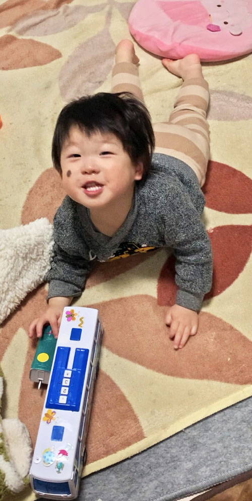 寝転んで電車やバスなど乗り物のおもちゃで遊んでます