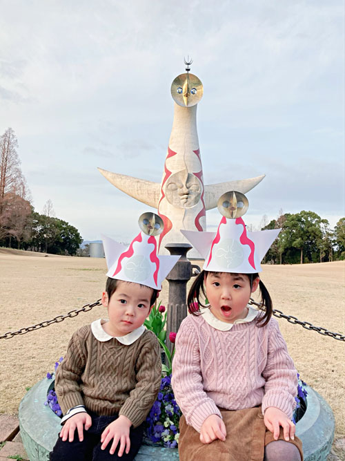 ママの手作り太陽の塔帽子をかぶって♡︎