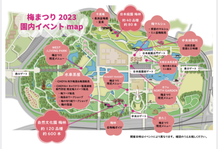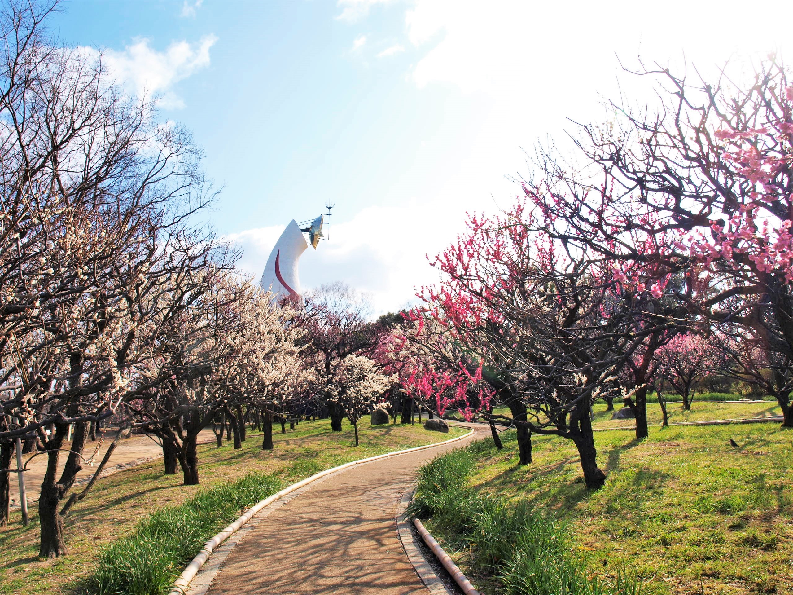万博記念公園内には大規模な梅林が二か所あり、開花時期に合わせて開催される「梅まつり」には毎年多くの人が訪れる。