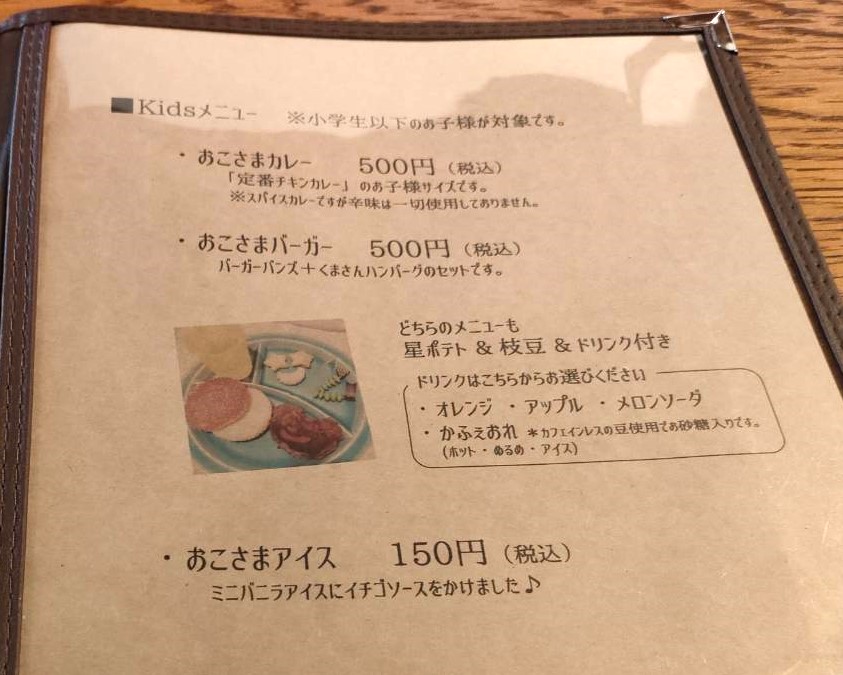 他にも「スイーツ」「ドリンク」「Kidsメニュー」があります。店内はテーブル席と座敷があって座敷には小さいお子さんが遊べるキッズコーナーが☆こういうのがあるだけでお母さん達はゆっくりおしゃべりが出来て嬉しいですよね(>_<)是非行ってみて下さい。