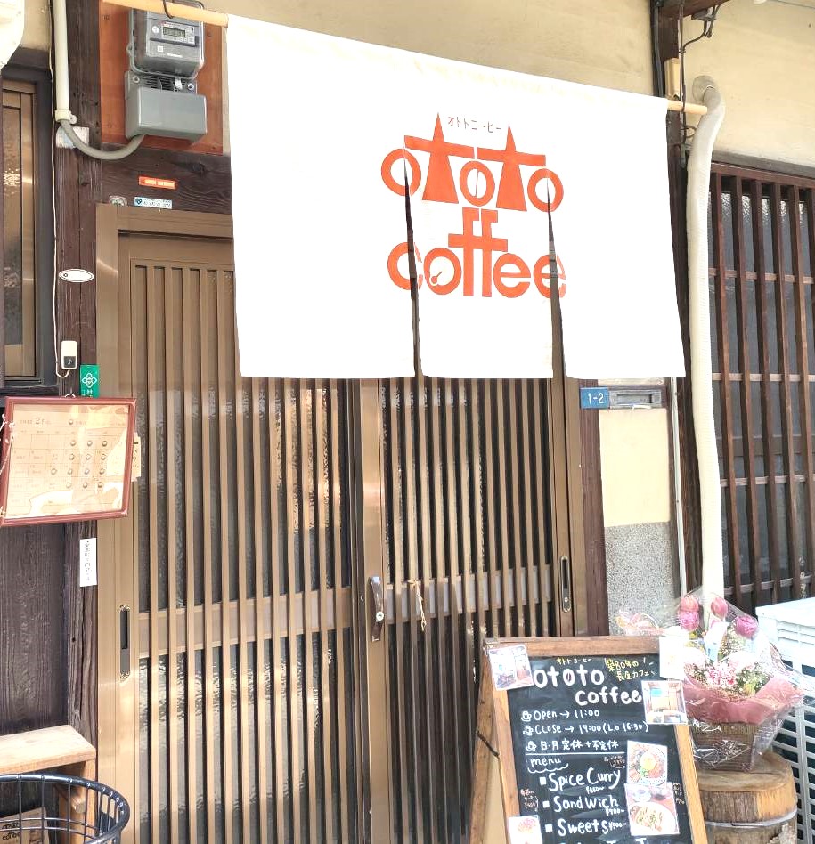 場所は商店街の近く。美容室とピザ屋さんの間の路地にお店はあります。店名の由来は、音楽が好き、珈琲が好きそんな店主がその両方を掛け合わせた場所を目指した「音と珈琲」=「オトトコーヒー」だそう。築80年の長屋の昔ながらの木造の建物は趣があります。
