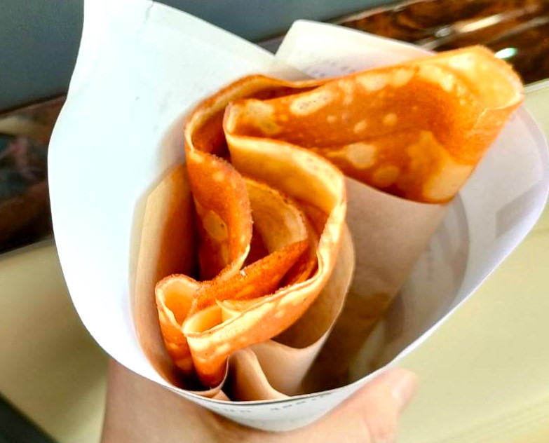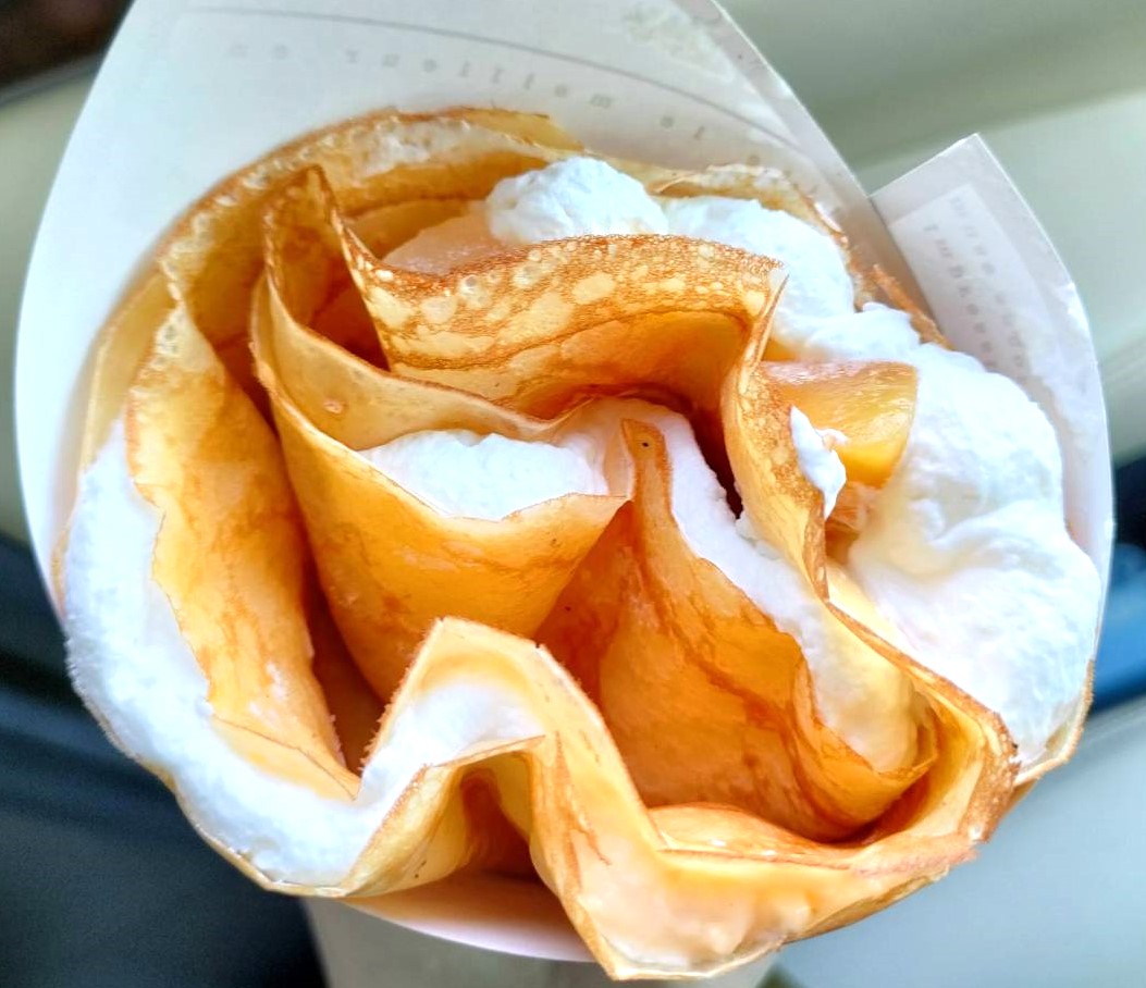 「フルーツミックス」の中身は「カスタード」「生クリーム」「Wクリーム」から選べます。今回はカスタードにしようかと思ったら「うちのカスタードは緩く作っているのでお持ち帰りでしたら生クリームで固定した方がいいかもしれません」と店長さん。ということでWクリームにしましたがこれが正解!生クリームもカスタードも優しい甘さなので甘ったるくなく生地の旨味と相まって◎是非行ってみて下さい。