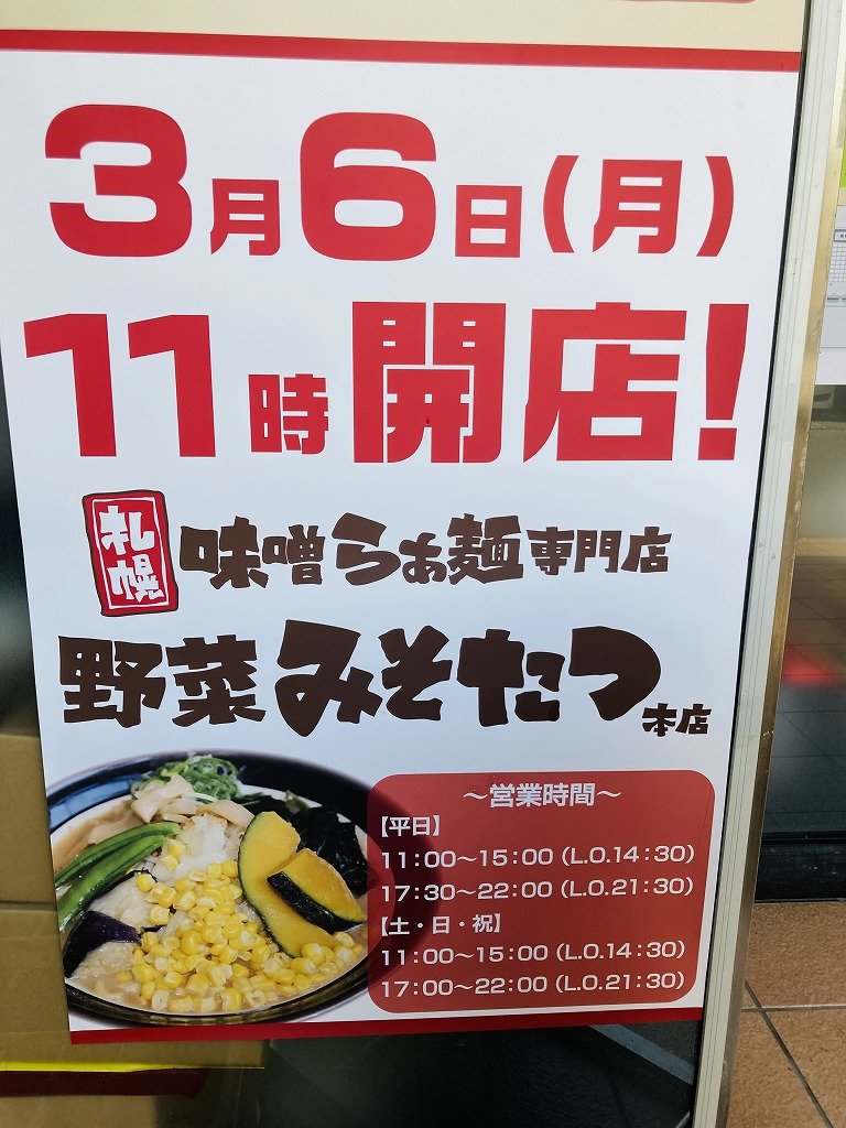 竹見台の「開運丸」さんあとにオープンした「札幌味噌らぁ麺専門店 野菜みそたつ本店」さん。