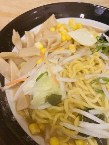 具材はコーン、メンマ、ネギ、ワカメ、もやし、キャベツ、ニンジンがたっぷりと入っています。