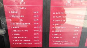メニューはこちら。ドリンクは懐かしいビン牛乳など18種類(200~250円)とカップ9種類(450~550円)があります。