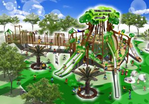 子どもたちのドキドキ感を刺激する新しい大型遊具「バオバブツリー」。3階層で構成され、スライダーやワクワクネットなど、25種類のインクルーシブな遊びアイテムが集結。防災機能も兼ね備えた新時代の遊具が誕生した。