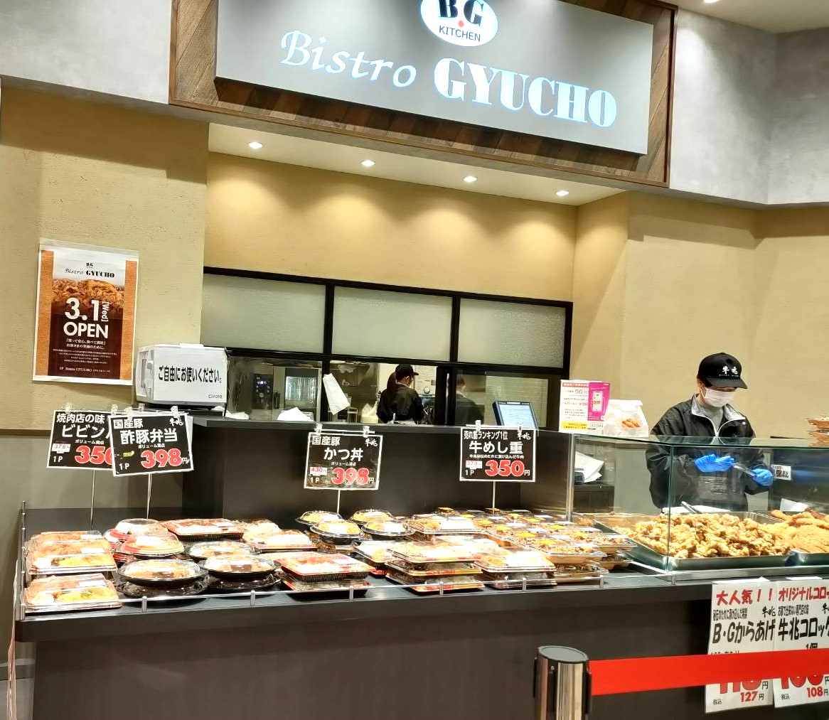 場所は1F「牛兆」のお隣。「Bistro GYUCHO」は長年の実績と独自のルートによりお手軽さと美味しさの両立を実現させた「牛兆」がお肉屋だから出来るメリットを最大限に生かした、からあげ・とんかつ・牛めし・弁当等を販売しています。