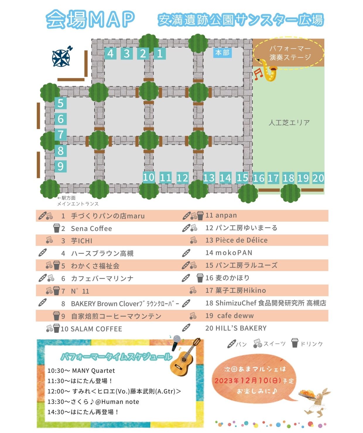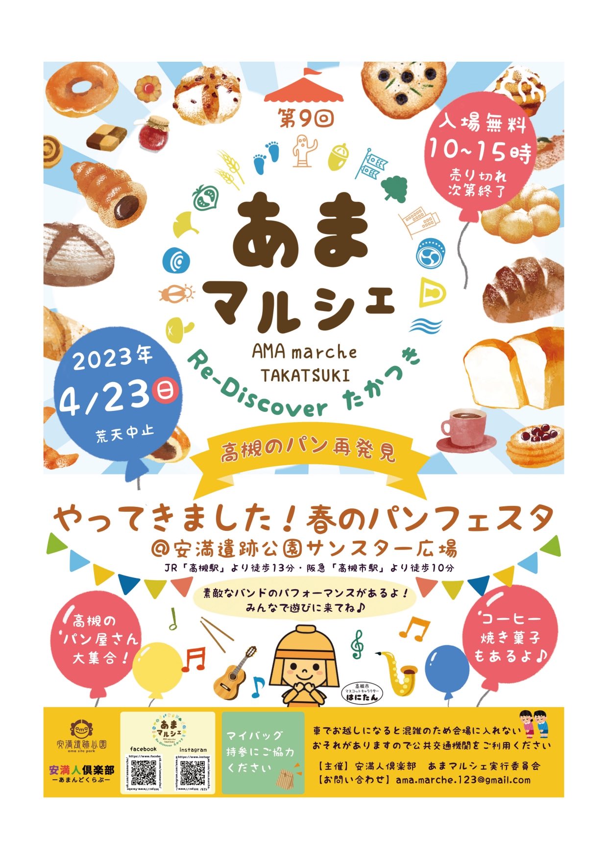 パン、焼き菓子やコーヒーをテーマに、高槻にゆかりのある店舗や高槻で営業している店舗に出店を限定した地域密着型マルシェ「あまマルシェ」が4/23(日)に開催される。9 回目となる今回も人気の20店が勢ぞろい。素敵な音楽パフォーマンスや市マスコットキャラクターのはにたんも登場。音楽とおいしい「高槻」を満喫しよう。