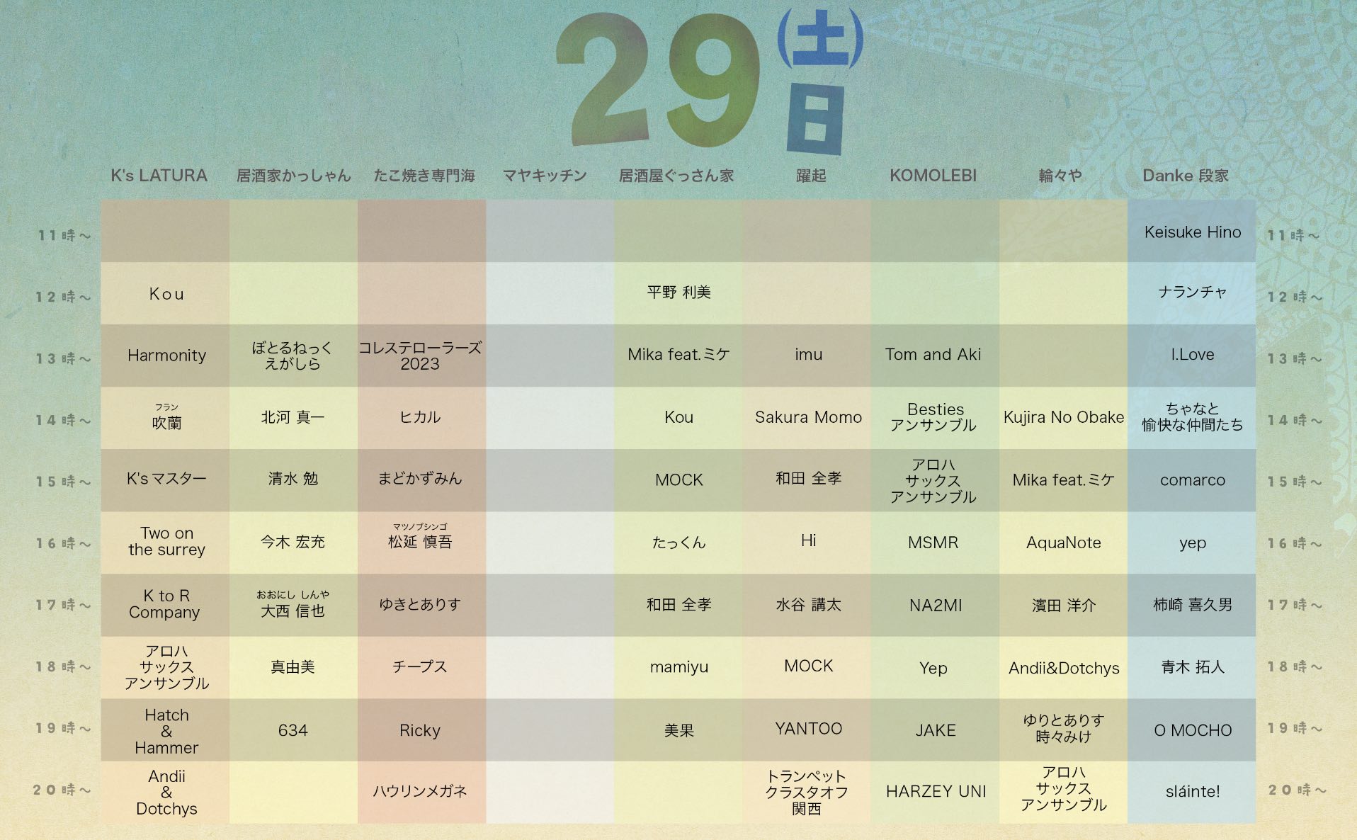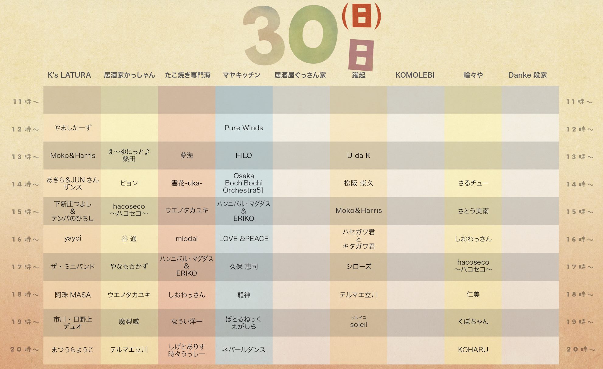 各店あわせて約90組のアーティストが出演し、ギターの弾き語りや海外楽器を使った演奏、オリジナル楽器の演奏などジャンルは様々。