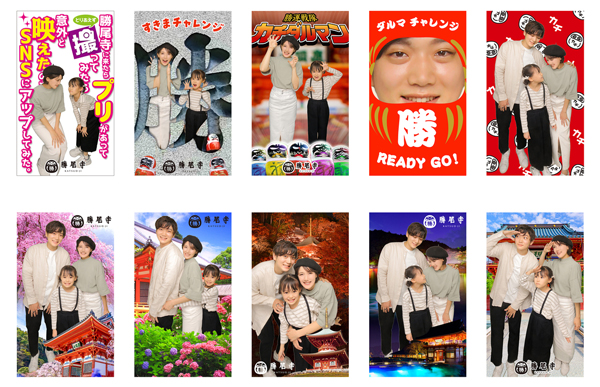 勝尾寺限定の「背景デザイン」は、勝尾寺の美しい境内を背景にしたフレームや、「ダルマ」になりきる「ダルマチャレンジフレーム」、「勝」の文字の隙間から撮影する「すきまチャレンジフレーム」、戦隊ヒーロー風の「カチダルマン」